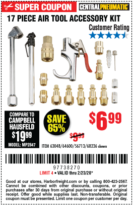 CENTRAL PNEUMATIC 17 PIECE AIR TOOL ACCESSORY KIT Lot No. 63048/63133/64600/56713/68236 Expired: 2/23/20 - $6.99 Coupon Code: '97738270'