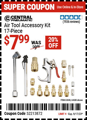 CENTRAL PNEUMATIC 17 PIECE AIR TOOL ACCESSORY KIT Lot No. 63048/63133/64600/56713/68236 Expired: 9/17/23 - $7.99 Coupon Code: '52213872'