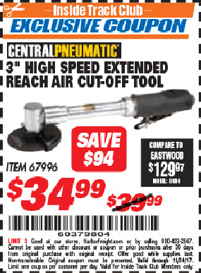 ITC CENTRAL PNEUMATIC 3 IN. HIGH SPEED EXTENDED REACH AIR CUT-OFF TOOL Lot No. 67996 Expired: 11/30/17 - $34.99 Coupon Code: '60379804'