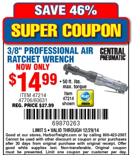 CENTRAL PNEUMATIC 3/8 IN. AIR RATCHET WRENCH Lot No. 47214/60631 Expired: 12/29/14 - $14.99 Coupon Code: '69870263'