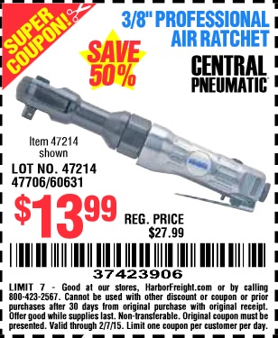 CENTRAL PNEUMATIC 3/8 IN. AIR RATCHET WRENCH Lot No. 47214/60631 Expired: 2/7/15 - $13.99 Coupon Code: '37423906'