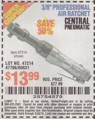 CENTRAL PNEUMATIC 3/8 IN. AIR RATCHET WRENCH Lot No. 47214/60631 Expired: 3/28/15 - $13.99 Coupon Code: '25754575'