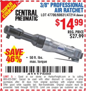 CENTRAL PNEUMATIC 3/8 IN. AIR RATCHET WRENCH Lot No. 47214/60631 Expired: 10/12/15 - $14.99 Coupon Code: '41117600'