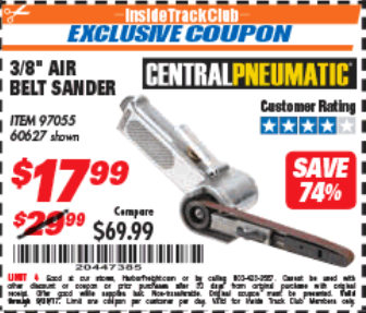 ITC CENTRAL PNEUMATIC 3/8 IN. BELT AIR SANDER Lot No. 60627 Expired: 9/30/17 - $17.99 Coupon Code: '20447385'