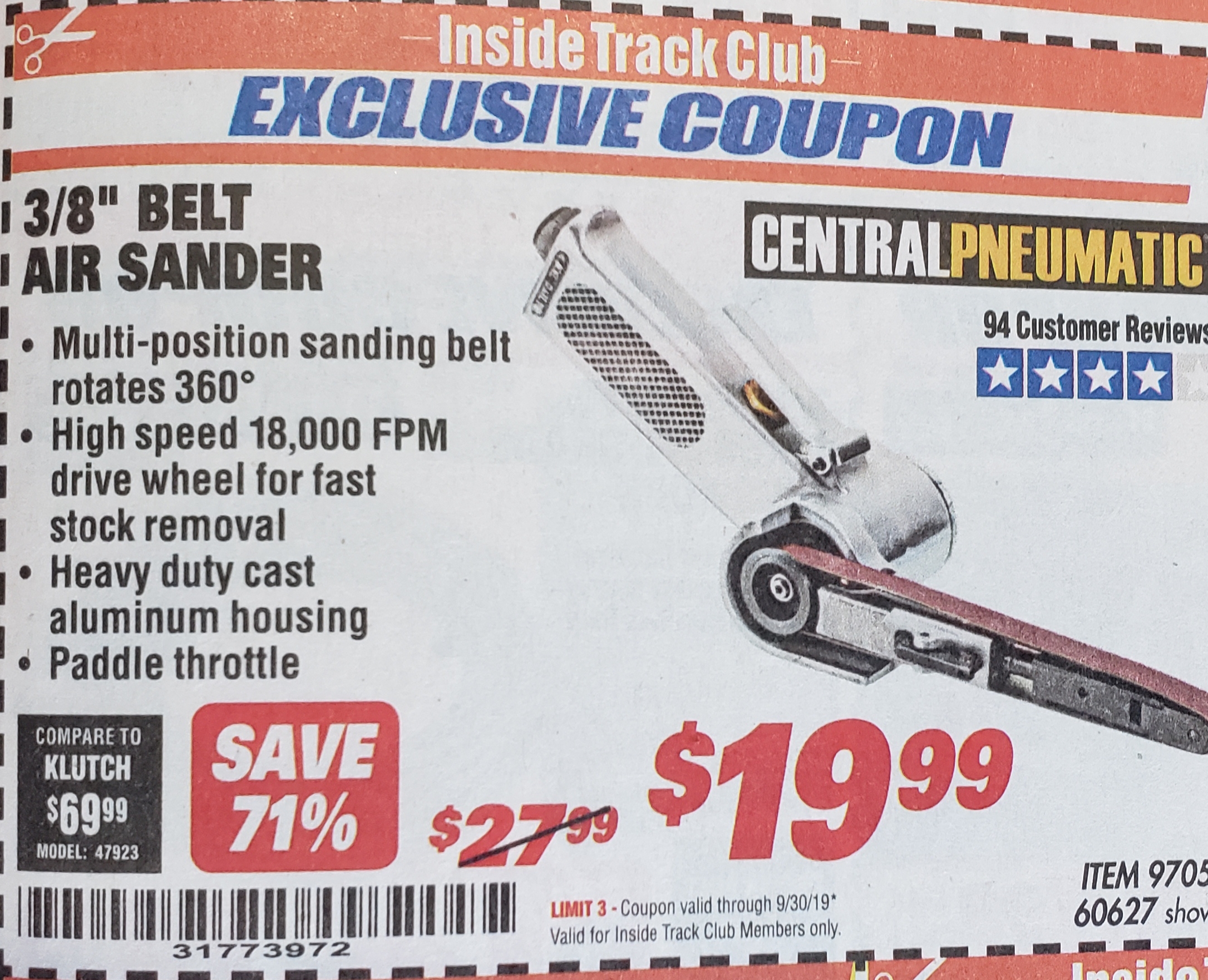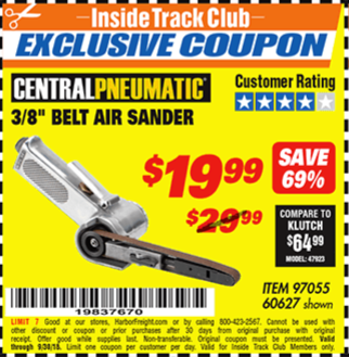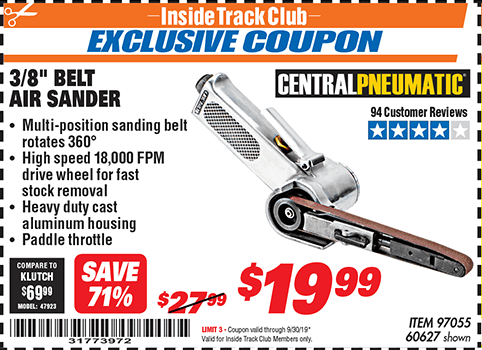 ITC CENTRAL PNEUMATIC 3/8 IN. BELT AIR SANDER Lot No. 60627 Expired: 9/30/19 - $19.99 Coupon Code: '31773972'