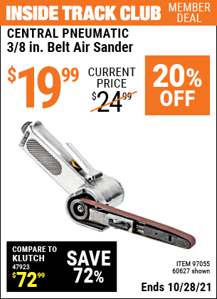 ITC CENTRAL PNEUMATIC 3/8 IN. BELT AIR SANDER Lot No. 60627 Expired: 10/28/21 - $19.99 Coupon Code: 'n/a'
