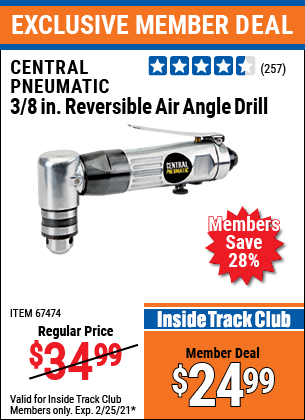 ITC CENTRAL PNEUMATIC 3/8 IN. REVERSIBLE AIR ANGLE DRILL Lot No. 67474/2439/69495 Expired: 5/31/21 - $24.99 Coupon Code: 'n/a'