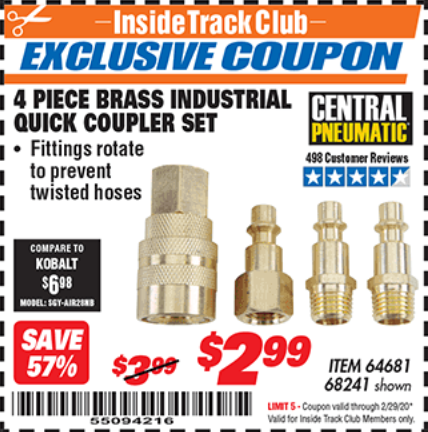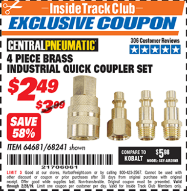 ITC CENTRAL PNEUMATIC 4-PIECE BRASS INDUSTRIAL QUICK COUPLER SET Lot No. 64681/68241 Expired: 2/29/20 - $2.99 Coupon Code: '55094216'