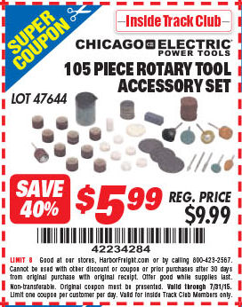 ITC CHICAGO ELECTRIC 105 PC. ROTARY TOOL ACCESSORY SET Lot No. 47644 Expired: 7/31/15 - $5.99 Coupon Code: '42234284'