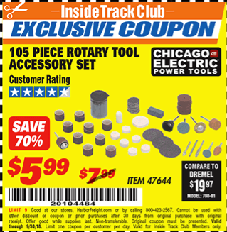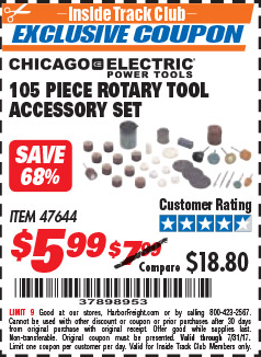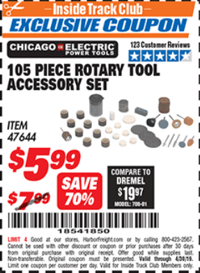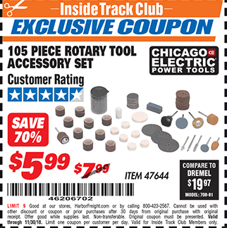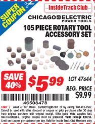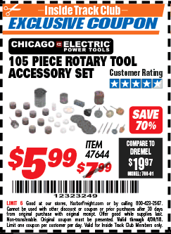 ITC CHICAGO ELECTRIC 105 PC. ROTARY TOOL ACCESSORY SET Lot No. 47644 Expired: 4/30/18 - $5.99 Coupon Code: '12323249'