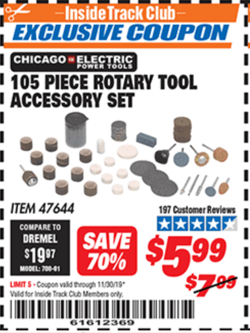 ITC CHICAGO ELECTRIC 105 PC. ROTARY TOOL ACCESSORY SET Lot No. 47644 Expired: 11/30/19 - $5.99 Coupon Code: '61612369'