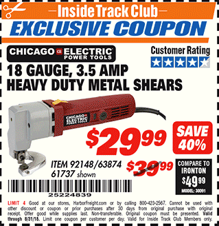 ITC CHICAGO ELECTRIC 18 GAUGE, 3.5 AMP HEAVY DUTY METAL SHEARS Lot No. 92148/63874/61737 Expired: 8/31/20 - $29.99 Coupon Code: '30370754'