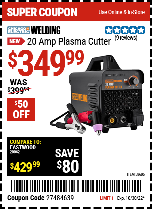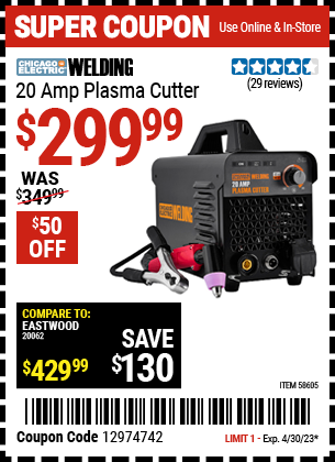 CHICAGO ELECTRIC 20 AMP PLASMA CUTTER Lot No. 58605 Expired: 4/30/23 - $299.99 Coupon Code: '12974742'