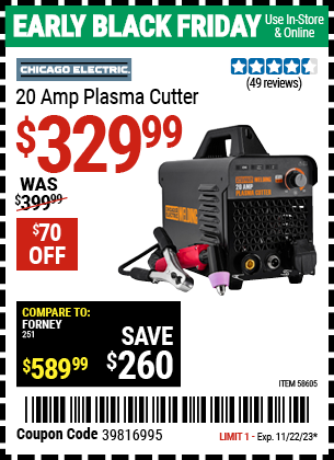 CHICAGO ELECTRIC 20 AMP PLASMA CUTTER Lot No. 58605 Expired: 11/22/23 - $329.99 Coupon Code: '39816995'
