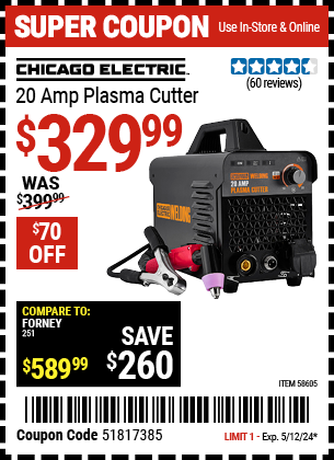 CHICAGO ELECTRIC 20 AMP PLASMA CUTTER Lot No. 58605 Expired: 5/12/24 - $329.99 Coupon Code: '51817385'