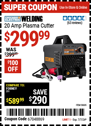 CHICAGO ELECTRIC 20 AMP PLASMA CUTTER Lot No. 58605 Expired: 7/7/24 - $299.99 Coupon Code: '67048869'