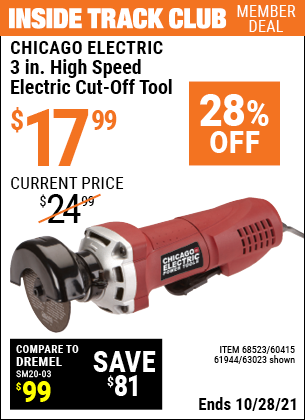 ITC CHICAGO ELECTRIC 3 IN HIGH SPEED ELECTRIC CUT-OFF TOOL Lot No. 61944 Expired: 10/28/21 - $17.99 Coupon Code: 'n/a'
