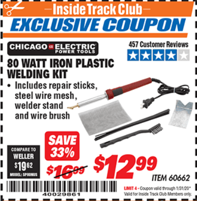 ITC CHICAGO ELECTRIC 80 WATT IRON PLASTIC WELDING KIT Lot No. 60662 Expired: 1/31/20 - $12.99 Coupon Code: '40029861'