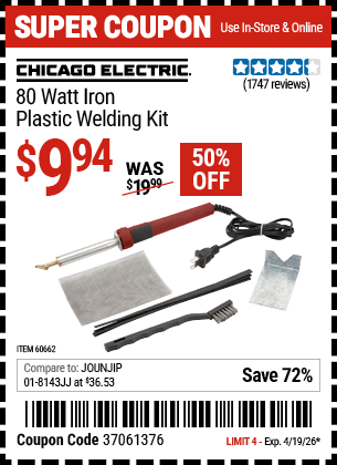 ITC CHICAGO ELECTRIC 80 WATT IRON PLASTIC WELDING KIT Lot No. 60662 Expired: 4/30/19 - $12.99 Coupon Code: '18241912'