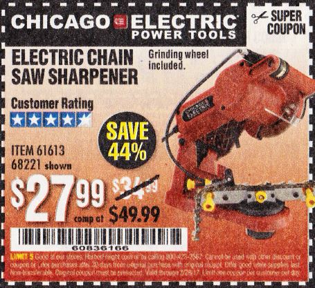 CHICAGO ELECTRIC POWER TOOLS ELECTRIC CHAINSAW SHARPENER Lot No. 63803/68221/63804 Expired: 7/22/21 - $24.99 Coupon Code: 'n/a'