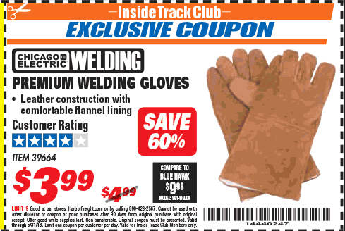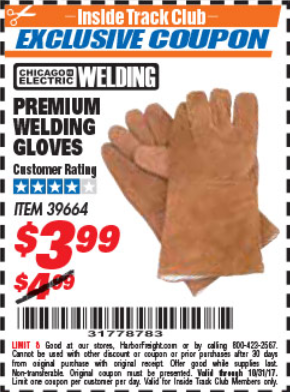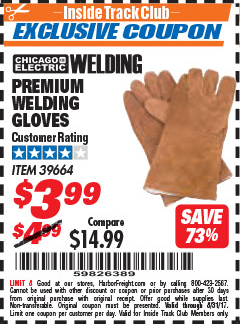 ITC CHICAGO ELECTRIC PREMIUM WELDING GLOVES Lot No. 39664 Expired: 10/31/17 - $3.99 Coupon Code: '31778783'