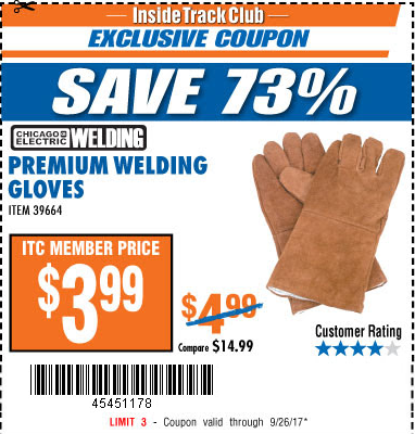 ITC CHICAGO ELECTRIC PREMIUM WELDING GLOVES Lot No. 39664 Expired: 9/26/17 - $3.99 Coupon Code: '45451178'