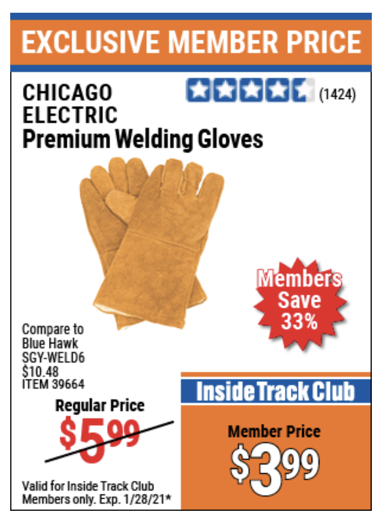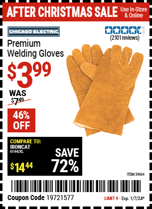 ITC CHICAGO ELECTRIC PREMIUM WELDING GLOVES Lot No. 39664 Expired: 1/28/21 - $3.99 Coupon Code: 'n/a'