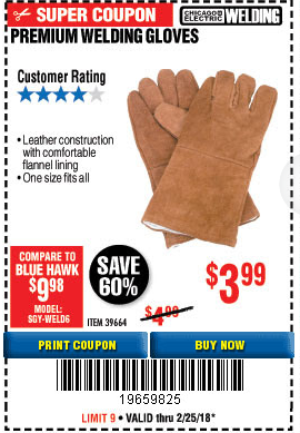 CHICAGO ELECTRIC PREMIUM WELDING GLOVES Lot No. 39664 Expired: 2/25/18 - $3.99 Coupon Code: '19659825'