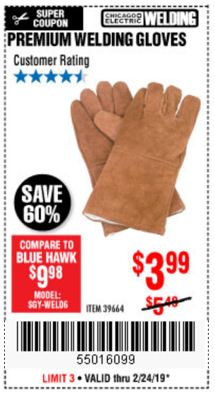 CHICAGO ELECTRIC PREMIUM WELDING GLOVES Lot No. 39664 Expired: 2/24/19 - $3.99 Coupon Code: '55016099'
