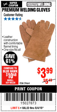 CHICAGO ELECTRIC PREMIUM WELDING GLOVES Lot No. 39664 Expired: 5/26/19 - $3.99 Coupon Code: '71380979'
