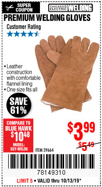 CHICAGO ELECTRIC PREMIUM WELDING GLOVES Lot No. 39664 Expired: 10/13/19 - $3.99 Coupon Code: '78149310'