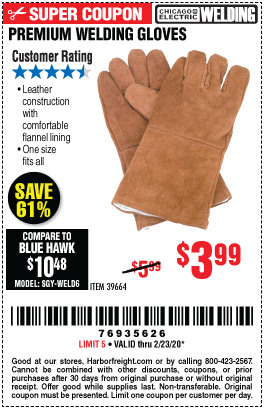 CHICAGO ELECTRIC PREMIUM WELDING GLOVES Lot No. 39664 Valid Thru: 10/30/25 - $5.99 Coupon Code: 'n/a' (current price - 20% = 0) add to list