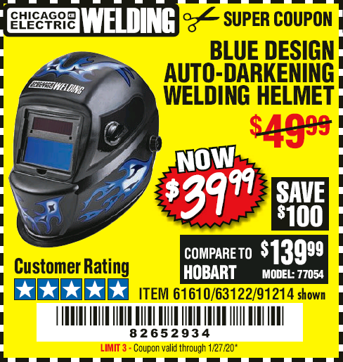 CHICAGO ELECTRIC WELDING BLUE DESIGN AUTO-DARKENING WELDING HELMET Lot No. 61610/63122/91214 Expired: 1/27/20 - $39.99 Coupon Code: '82652934'