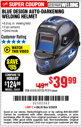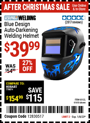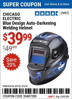 CHICAGO ELECTRIC WELDING BLUE DESIGN AUTO-DARKENING WELDING HELMET Lot No. 61610/63122/91214 Expired: 12/31/20 - $39.99 Coupon Code: '80827673'