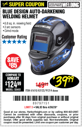 CHICAGO ELECTRIC WELDING BLUE DESIGN AUTO-DARKENING WELDING HELMET Lot No. 61610/63122/91214 Expired: 6/30/20 - $39.99 Coupon Code: '89797151'