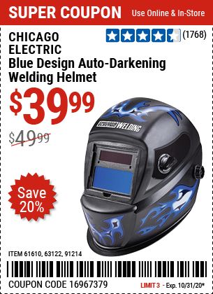 CHICAGO ELECTRIC WELDING BLUE DESIGN AUTO-DARKENING WELDING HELMET Lot No. 61610/63122/91214 Expired: 10/31/20 - $39.99 Coupon Code: '16967379'