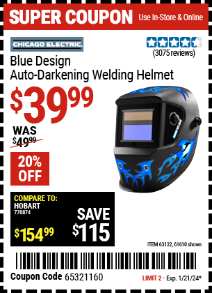 CHICAGO ELECTRIC WELDING BLUE DESIGN AUTO-DARKENING WELDING HELMET Lot No. 61610/63122/91214 Expired: 1/21/24 - $39.99 Coupon Code: '65321160'