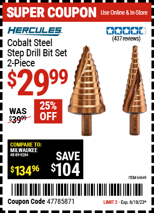 COBALT STEEL SETP DRILL BIT SET 2PC Lot No. 64649 Expired: 6/18/23 - $29.99 Coupon Code: '47785871'