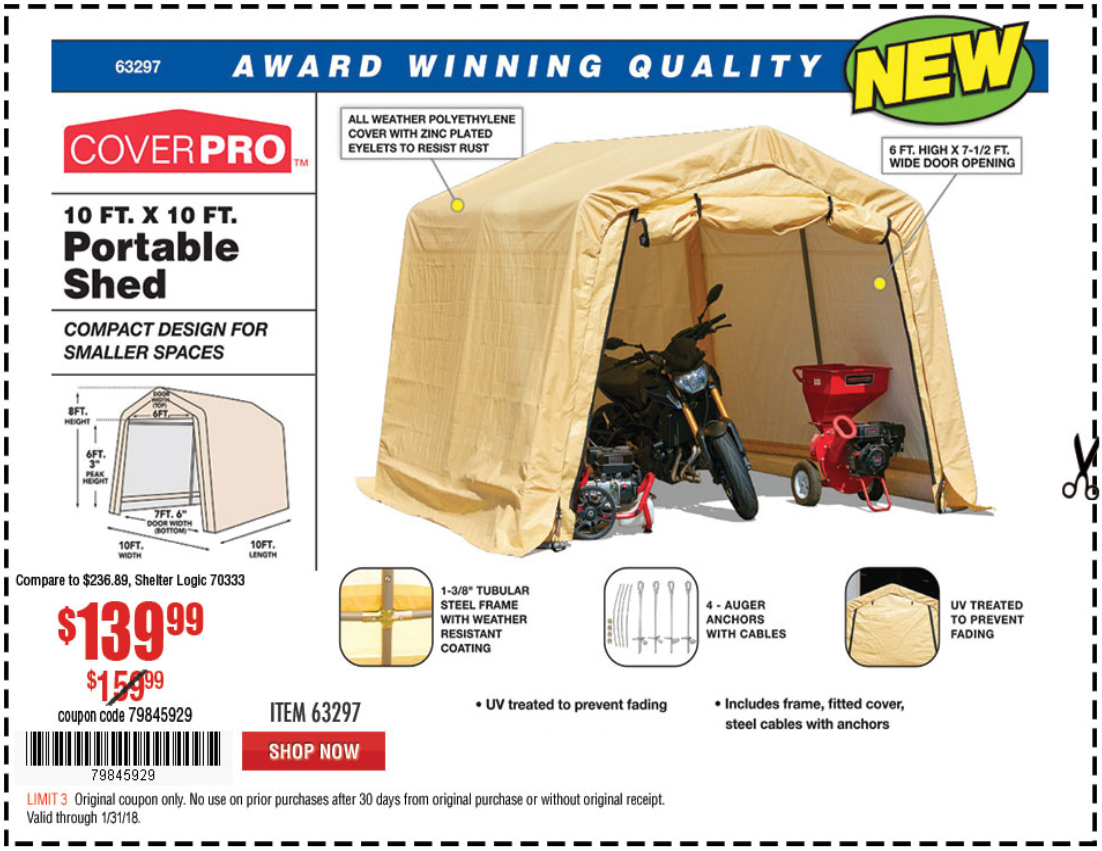 COVERPRO 10 FT. X 10 FT. PORTABLE SHED Lot No. 63297 Expired: 1/31/18 - $139.99 Coupon Code: '79845929'