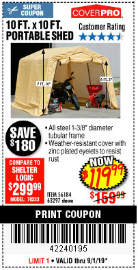 COVERPRO 10 FT. X 10 FT. PORTABLE SHED Lot No. 63297 Expired: 9/1/19 - $119.99 Coupon Code: '42240195'