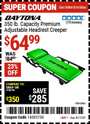 DAYTONA 350 LB. CAPACITY PREMIUM ADJUSTABLE HEADREST CREEPER Lot No. 58865 Expired: 7/16/23 - $59.99 Coupon Code: '65598712'
