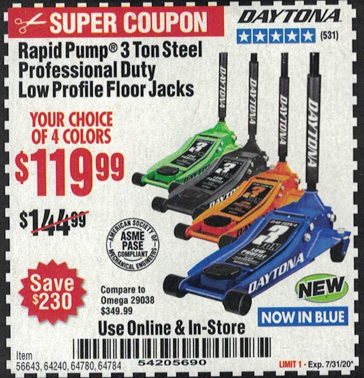 DAYTONA RAPID PUMP 3 TON STEEL LOW PROFILE FLOOR JACKS Lot No. 64360/64883/64240/64784/56261/64780 Expired: 6/30/19 - $119.99 Coupon Code: '70262816'