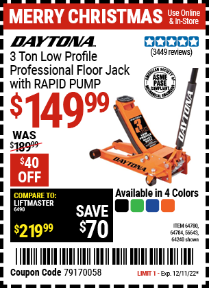 DAYTONA RAPID PUMP 3 TON STEEL LOW PROFILE FLOOR JACKS Lot No. 64360/64883/64240/64784/56261/64780 Expired: 12/11/22 - $149.99 Coupon Code: '79170058'