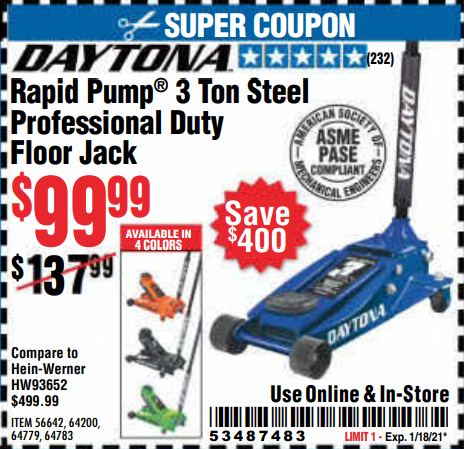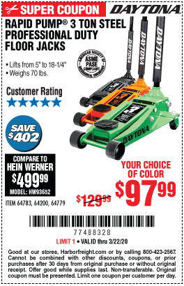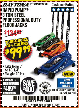 DAYTONA RAPID PUMP 3 TON STEEL PROFESSIONAL DUTY FLOOR JACKS Lot No. 64783/64200/64779 Expired: 6/30/20 - $99.99 Coupon Code: '93002777'