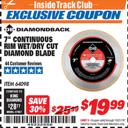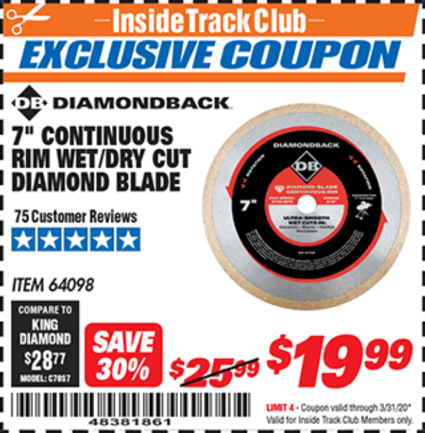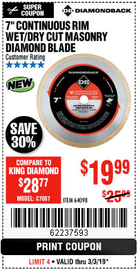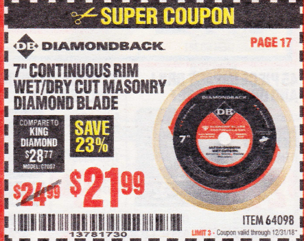 DIAMONDBACK 7" CONTINUOUS RIM WET/DRY CUT MASONRY DIAMOND BLADE Lot No. 64098 Expired: 3/3/19 - $19.99 Coupon Code: '62237593'