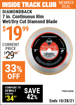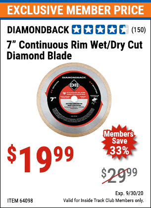 DIAMONDBACK 7" CONTINUOUS RIM WET/DRY CUT MASONRY DIAMOND BLADE Lot No. 64098 Expired: 7/31/19 - $229.99 Coupon Code: '51521242'