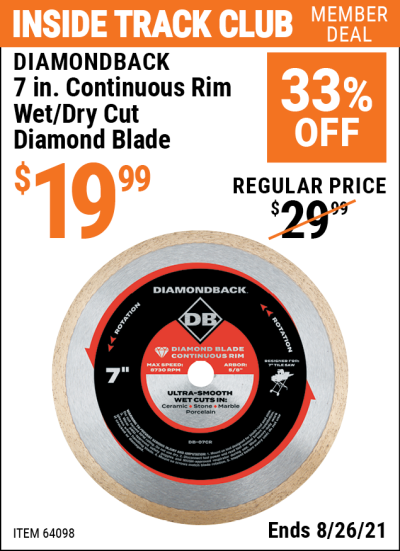 ITC DIAMONDBACK 7" CONTINUOUS RIM WET/DRY CUT MASONRY DIAMOND BLADE Lot No. 64098 Expired: 8/26/21 - $19.99 Coupon Code: 'n/a'