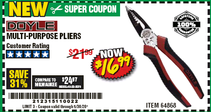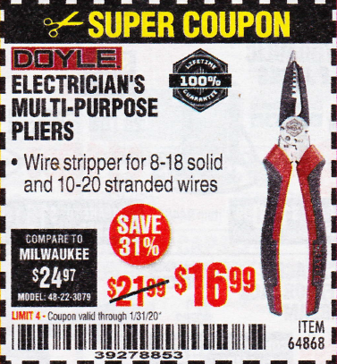 DOYLE ELECTRICIANS MULTIPURPOSE PLIERS Lot No. 64868 Expired: 1/31/20 - $16.99 Coupon Code: '39278853'