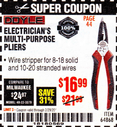 DOYLE ELECTRICIANS MULTIPURPOSE PLIERS Lot No. 64868 Expired: 2/29/20 - $16.99 Coupon Code: '18180569'