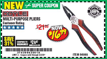 DOYLE ELECTRICIANS MULTIPURPOSE PLIERS Lot No. 64868 Expired: 1/26/20 - $16.99 Coupon Code: '29967022'